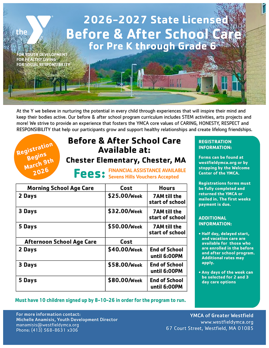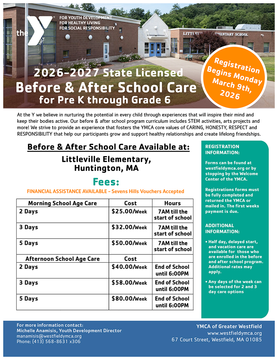 Full day care is from 7:00AM to 6:00PM for children ages 5 to 12. Sign in and out for the children will be at the Littlveville in the cafeteria unless otherwise noted. If numbers are low full days will take place at the YMCA, Located at 67 Court St. Westfield. Parents will be notified the Friday before.