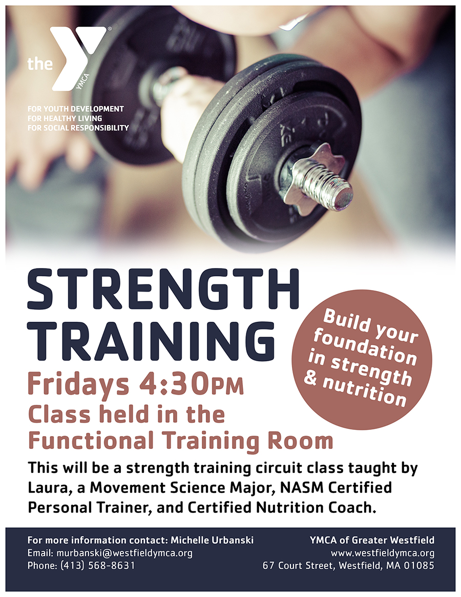 Join us Fridays for Strength Training at 4:30pm, with Laura, a movement science major, NASM certified personal trainer, and certified nutrition coach.